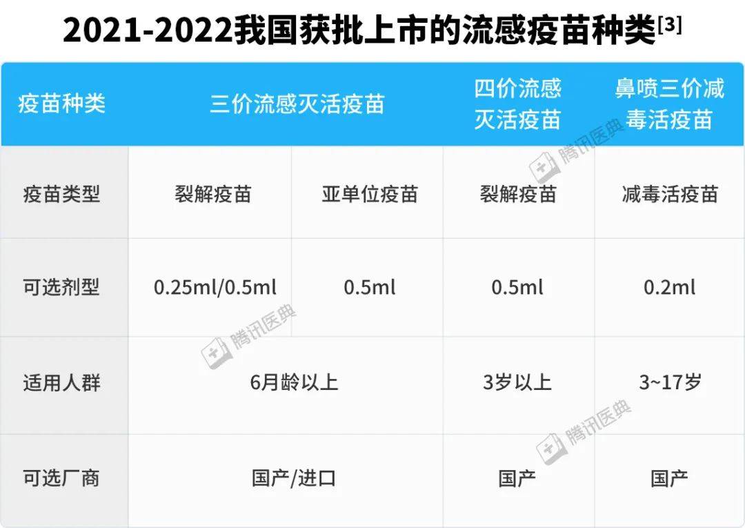 我國2021~2022年批準上市的流感疫苗大體可以分為三類(lèi):三價(jià)注射滅活流感疫苗(IIV3),四價(jià)注射滅活流感疫苗(IIV4),以及三價(jià)鼻噴流感減毒活疫苗(LAIV3)。其中,四價(jià)流感疫苗比三價(jià)疫苗可以多預防乙型流感毒株亞型的流感病毒。